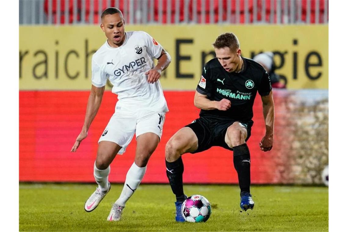 Sandhausens Nikolas Nartey und Fürths Paul Jaeckel (l-r.) am Ball. Foto: Uwe Anspach/dpa