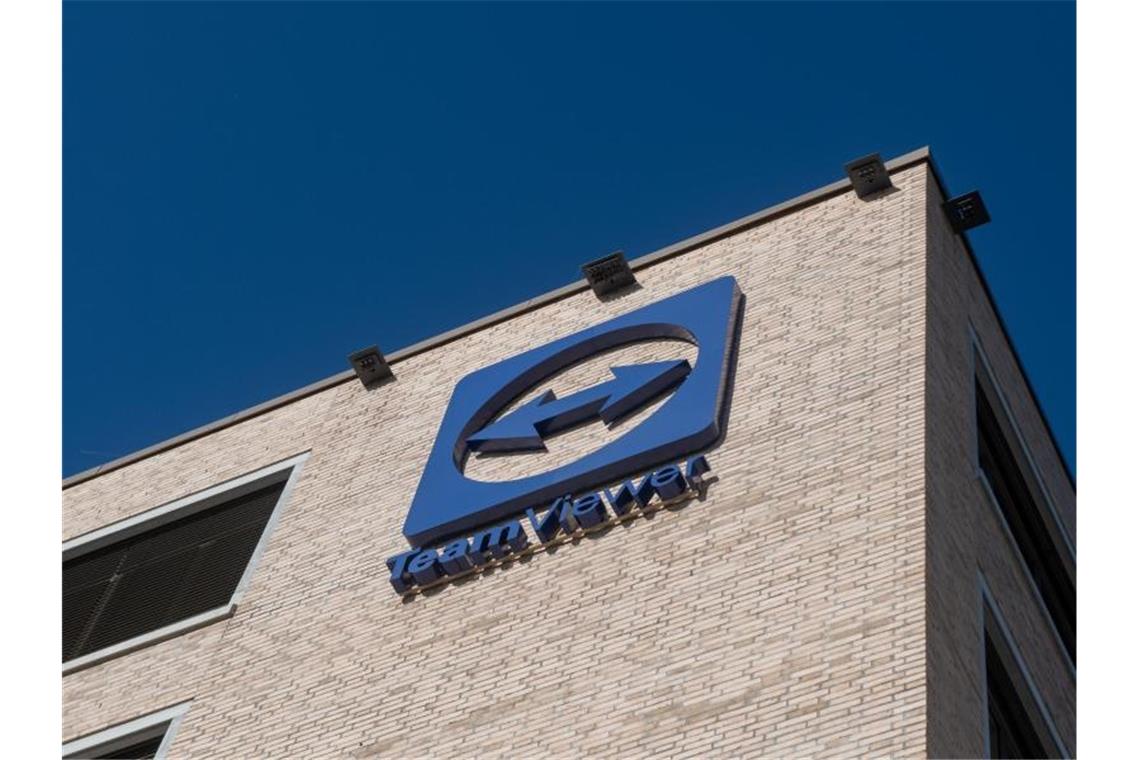 Das Logo von Teamviewer hängt an der Fassade eines Gebäudes. Foto: Stefan Puchner/dpa/Archivbild
