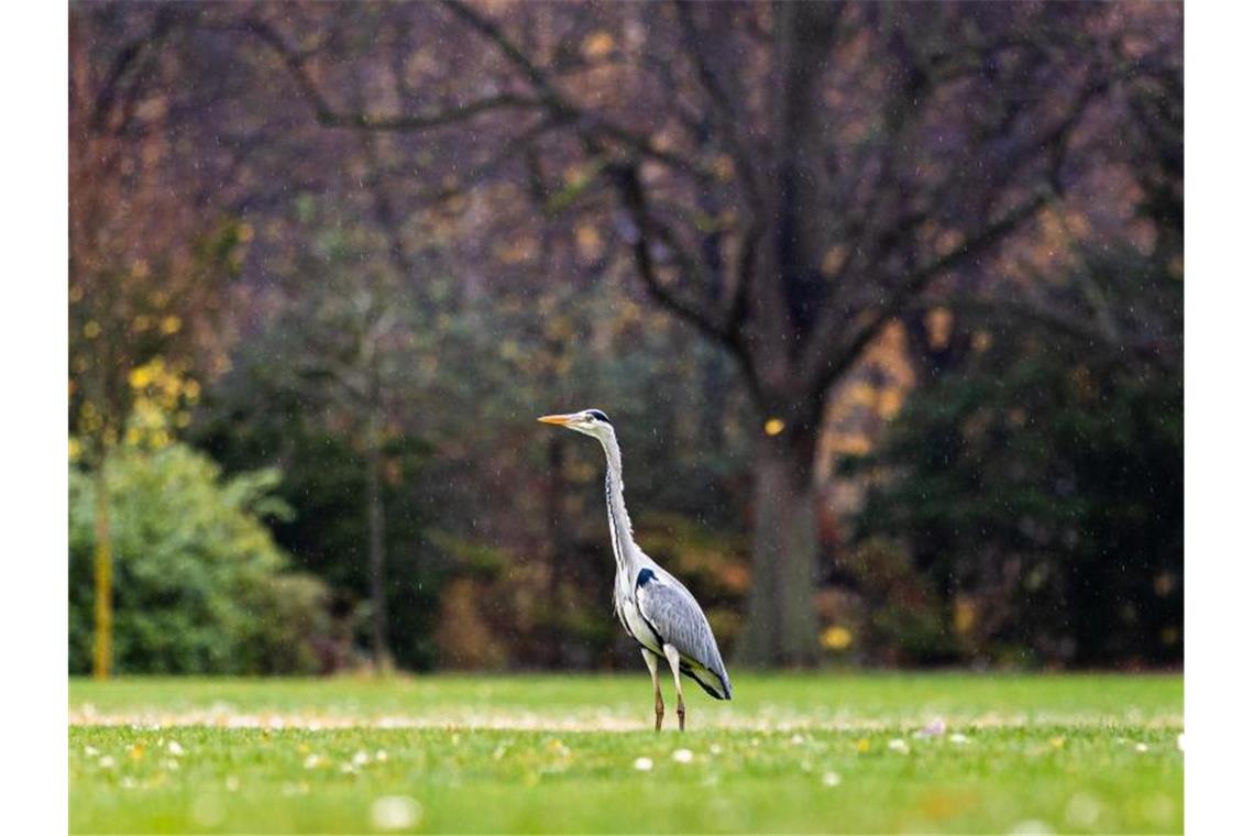 Ein Graureiher im Regen. Foto: Moritz Frankenberg/dpa