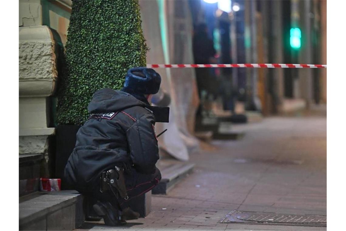 Ein Polizist inspiziert den Tatort an der Zentrale des FSB in Moskau. Foto: Maxim Grigoryev/TASS/dpa