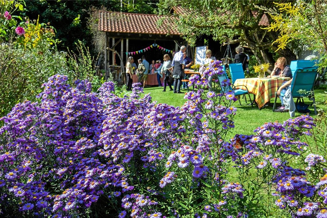 Gesundheit im Wald: Wie in den Vorjahren ist auch dieses Mal das Thema Kräuter vertreten. Sowohl die Kräuterterrassen Kaisersbach haben geöffnet als auch das Kräuterzentrum Wasenhof. Letzteres hat anlässlich seines 15-jährigen Bestehens zum Tag der offenen Tür mit gläserner Produktion, Betriebs- und Kräuterführungen geladen. Christine Pommerer hat auf dem Wasenhof in den zurückliegenden Jahren ein Kleinod geschaffen mit verwunschenen Winkeln, wunderbaren Ausblicken, einem herrlichen Schaugarten. Über das ganze Gelände verteilen sich Stände, an denen Pommerers frisch gebackene Absolventinnen und Absolventen der Heilkräuterpädagogikausbildung ihre Arbeit präsentieren. Das reicht vom Herstellen von Efeuseife über das Produzieren von Kräuterdüften bis zur klingenden, märchenhaften Auszeit im kühlen Schatten unter der Märchenlinde: Annette ist aus dem Rhein-Main-Gebiet angereist, um auf der keltischen Harfe oder der Gitarre Lieder über Heilpflanzen zu singen, und Claudia aus Althütte, um Märchen von Bäumen oder Kräutern zu erzählen. Obwohl der Besucherandrang beim Kräuterzentrum riesig ist, entsteht unter der Linde so ein Rückzugsort zum Lauschen und Träumen.