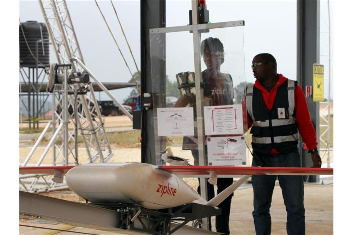 Vorbereitung einer Drohne, die lebensrettende Blutkonserven zu einer weit entlegenen Klinik im ostafrikanischen Ruanda fliegen soll. Foto: Kristin Palitza