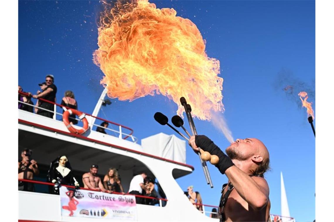 Ein Teilnehmer des „Torture Ship“ im letzten Jahr spuckt am Hafensteg Feuer. Foto: Felix Kästle/dpa/Archivbild