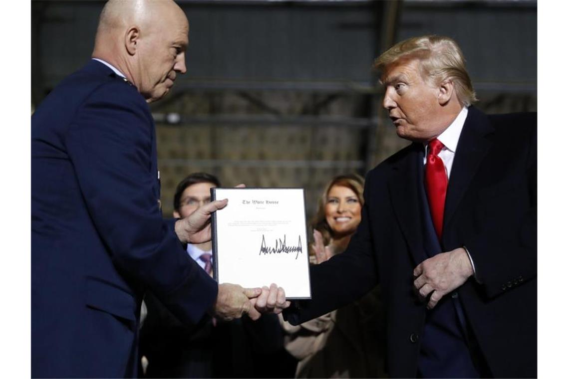US-Präsident Donald Trump überreicht General Jay Raymond (l) die Ernennungsurkunde als Befehlshaber der neuen „Space Force“. Foto: Andrew Harnik/AP/dpa