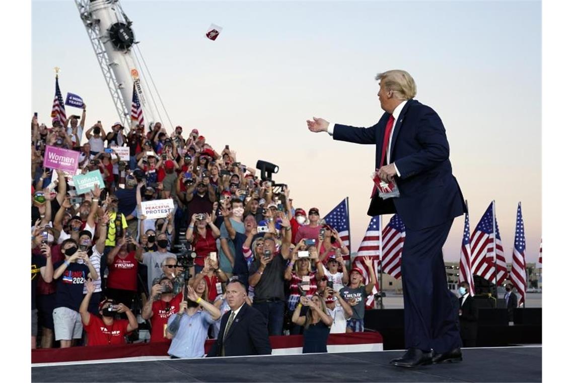 US-Präsident Trump wirft Gesichtsmasken in die Menge, als er zu einer Wahlkampfkundgebung am Orlando Sanford International Airport eintrifft. Foto: Evan Vucci/AP/dpa