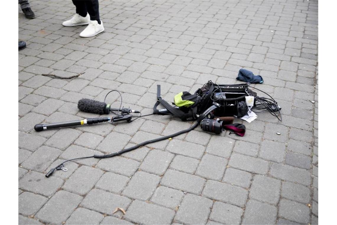 Die Ausrüstung des Kamerateams liegt nach der Attacke auf dem Boden. Foto: Christoph Soeder/dpa
