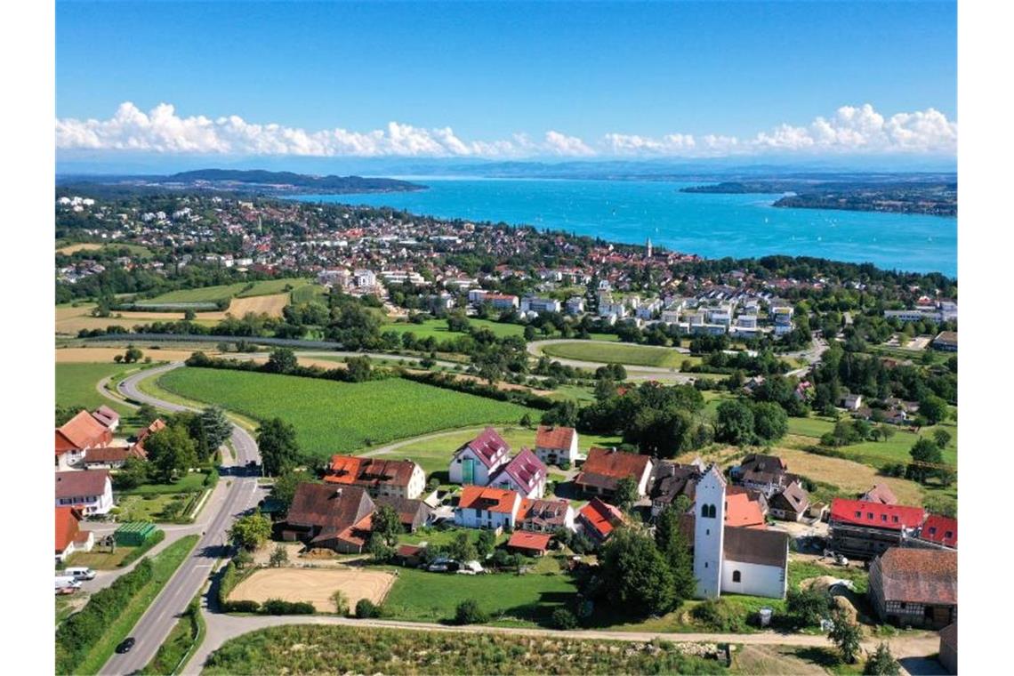 Hinter der Kirche Sankt Michael in Aufkirch (r) liegt Überlingen am Bodensee. Foto: Felix Kästle/dpa/Archivbild