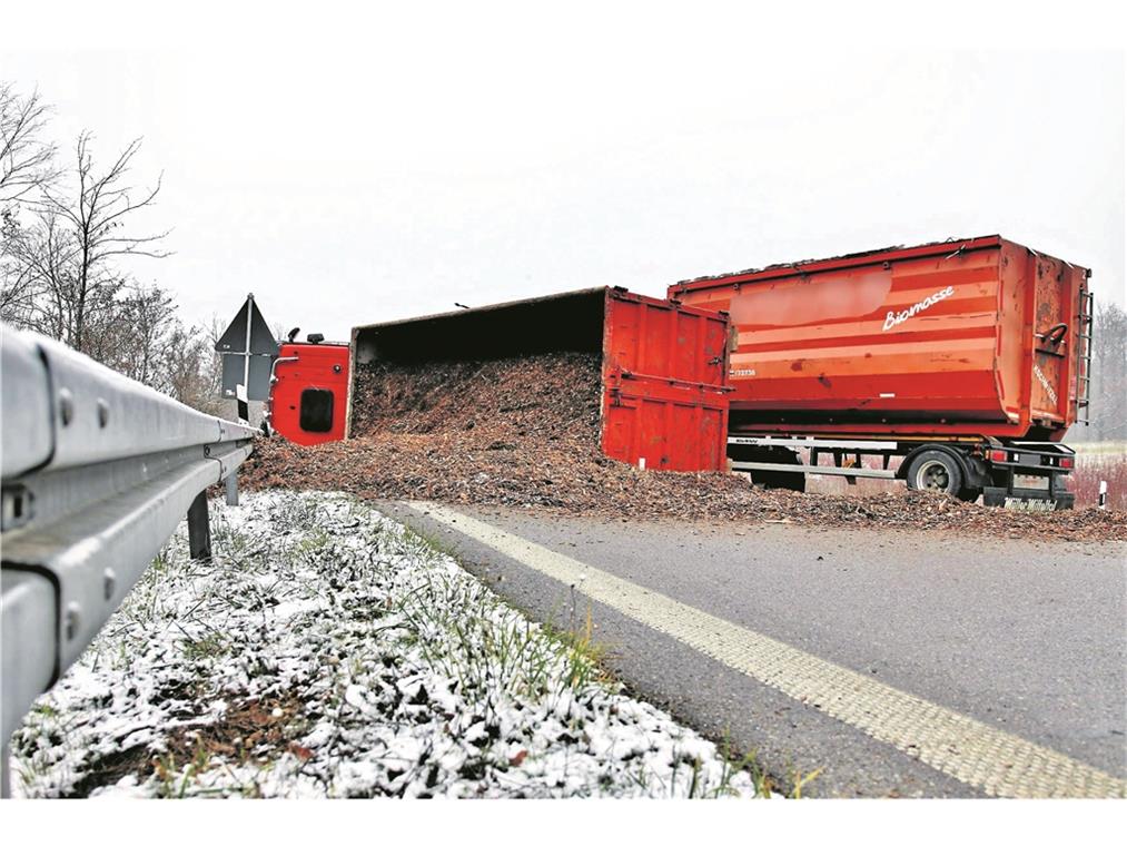 SCHWAIKHEIM (pol). Ein aus Schwaikheim kommender Lkw, der gestern kurz vor 9 Uhr aufgrund falscher Ladungssicherung auf der Auffahrt zur B14 in Richtung Stuttgart umgekippt ist, hat die Auffahrt für mehrere Stunden versperrt. Der 52-jährige Fahrer selbst wurde leicht verletzt. Am Lkw, der einen Container mit Holzschnitzeln mit sich führte, entstand ein Sachschaden in Höhe von rund 15000 Euro. Weiterhin wurden Leitpfosten und Verkehrsschilder im Wert von rund 1000 Euro beschädigt. Die Bergungsarbeiten sowie die polizeilichen Ermittlungen zur genauen Unfallursache dauerten bis Mittag. Foto: 7aktuell/Lermer