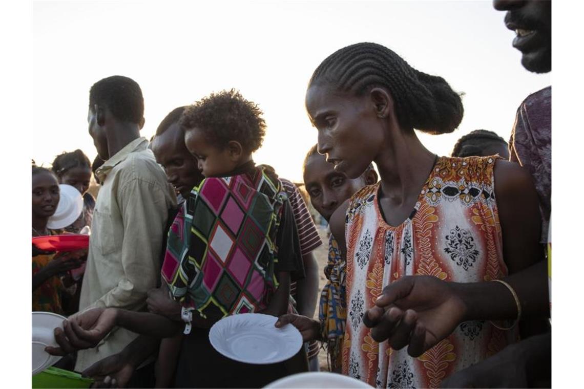 Menschen, die vor dem Konflikt in der äthiopischen Region Tigray geflohen sind, warten auf gekochten Reis in dem sudanesischen Flüchtlingslager Um Rakuba. Foto: Nariman El-Mofty/AP/dpa