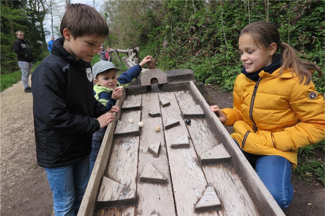 URBACH. „Klemmt“, sagt Lukas, vier Jahre alt. Macht aber nix, er hat ohnehin seine eigene Murmel von zu Hause mitgebracht und muss sich keine mehr aus dem eigens dafür aufgestellten Automaten lassen. Ernst Peter übernimmt die Aufgabe des Drehens. Nun macht der Automat, was er soll. Der Papa ist damit ebenfalls Besitzer einer Holzkugel. Die braucht es für unterwegs, schließlich sind Murmelbahnen angekündigt. Der Urbacher Urbär ist auf die Hölzer aufgedruckt, damit haben sie das Zeug zum Erinnerungsstück – solange sie nicht im Wald verloren gehen. Alle sind startklar, der Wald-Erlebnis-Pfad in Urbach wartet darauf, erkundet zu werden.