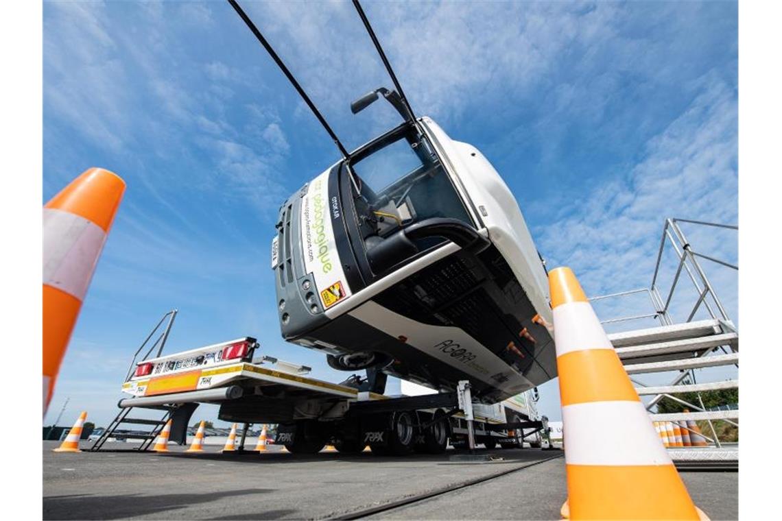Bei dem Versuchsaufbau auf dem Crashtestgelände kippt ein kleiner mit Insassen besetzter Reisebus per Hydraulik um 90 Grad auf die Seite. Foto: Guido Kirchner/dpa