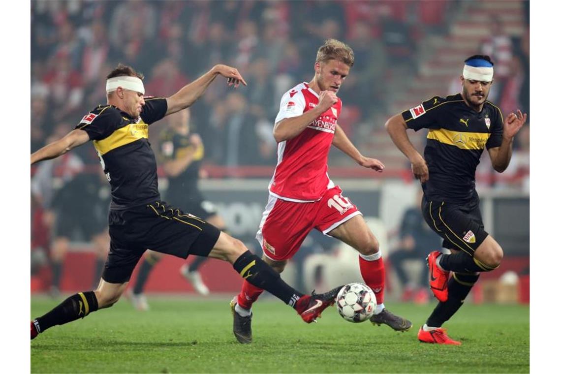 Sebastian Andersson (M) von Union und Holger Badstuber (l) und Ozan Kabak (r) von Stuttgart Stuttgart kämpfen um den Ball. Foto: Andreas Gora