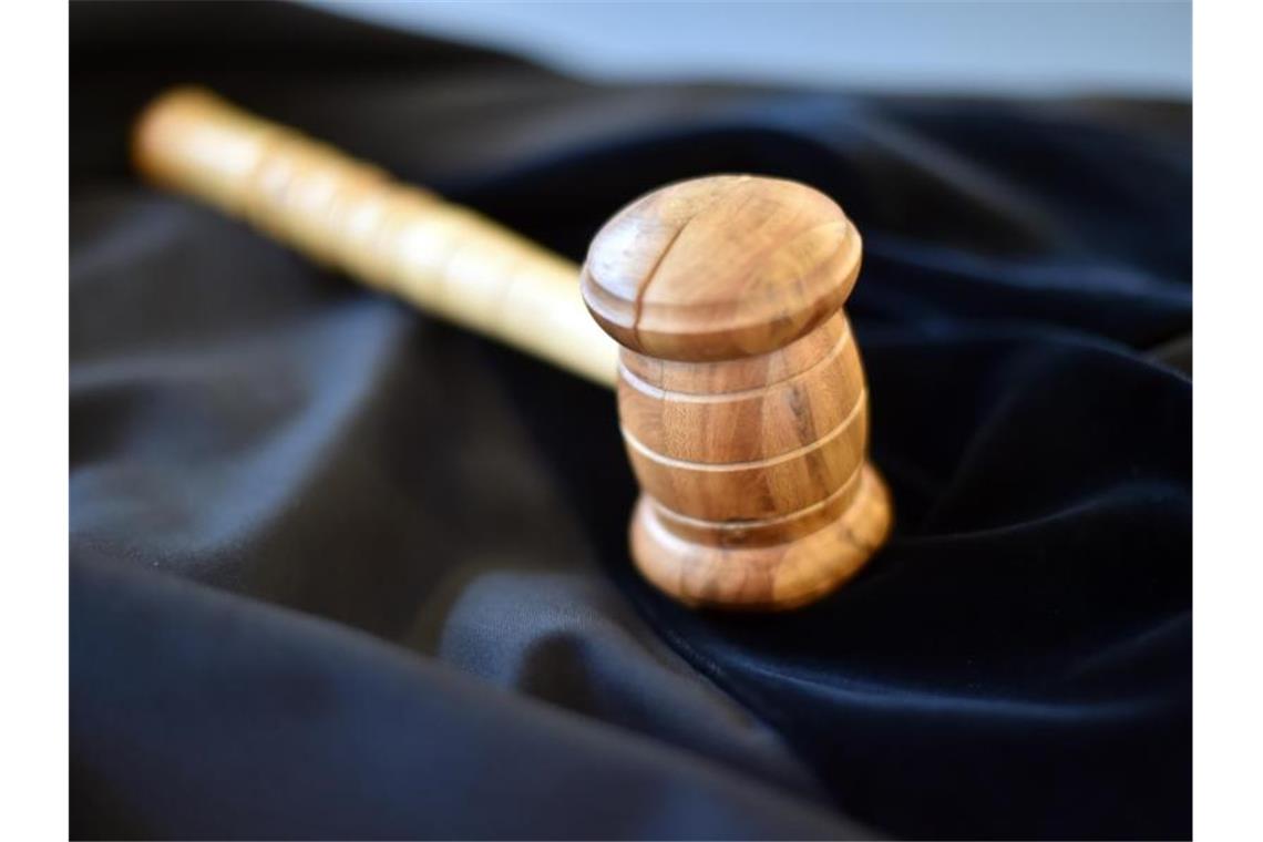 Auf einem Tisch in einem Gerichtssaal liegt ein Richterhammer aus Holz, darunter eine Richterrobe. Foto: picture alliance / dpa/Symbolbild