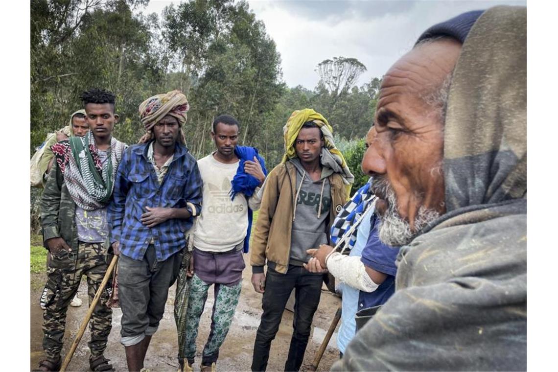 Männer versammeln sich, um mit dem am Arm verletzten Milizionär Kibret Bidere (2.v.r) in der Nähe des Dorfes in der Amhara-Region in Nordäthiopien zu sprechen. Foto: Uncredited/AP/dpa