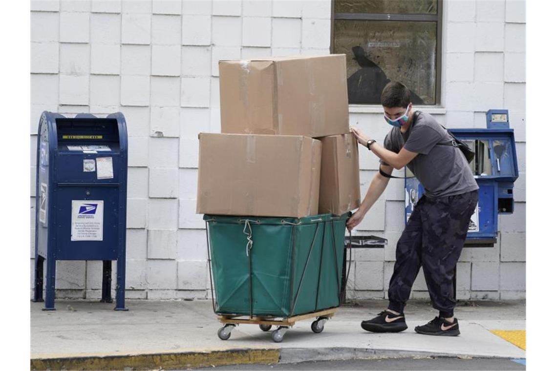Ein Mann trägt eine Schutzmaske während er große Paketboxen von einem Postamt in Los Angeles in ein Fahrzeug transportiert. Foto: Damian Dovarganes/AP/dpa