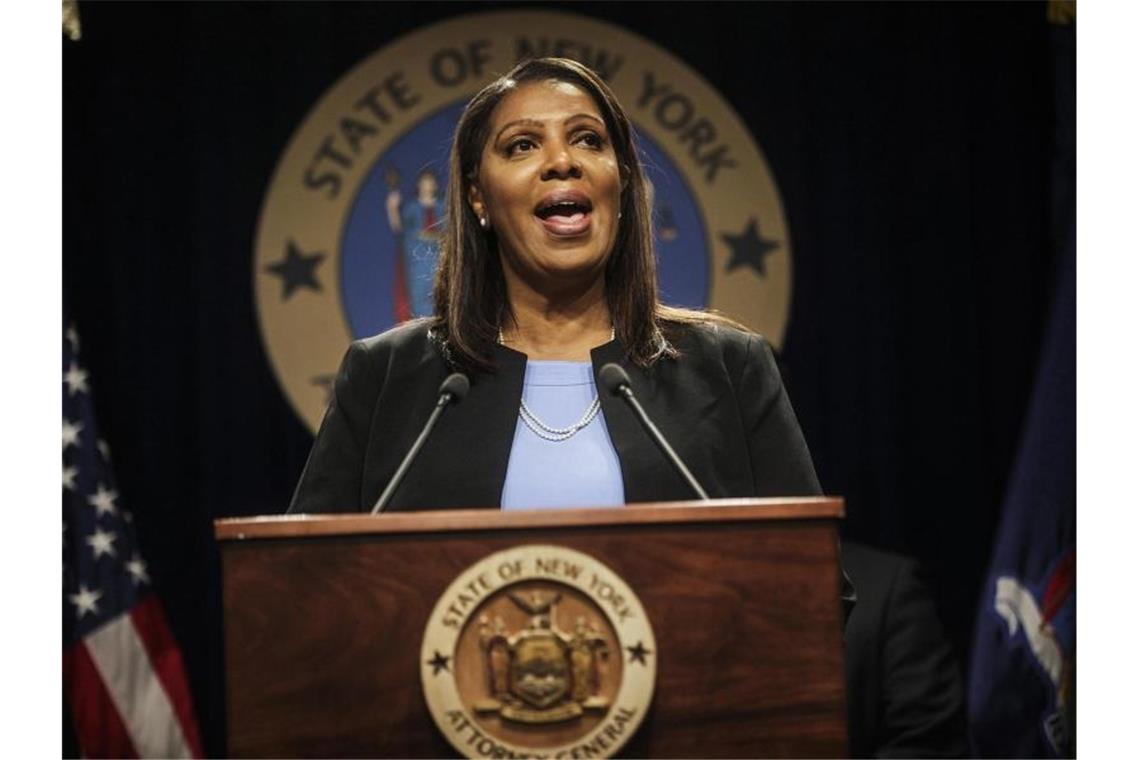 New Yorks Justizministerin Letitia James spricht auf einer Pressekonferenz. Im Rechtsstreit um süchtig machende Schmerzmittel haben vier große US-Pharmakonzerne einen milliardenschweren Vergleich angenommen. Foto: Byron Smith/TNS via ZUMA Wire/dpa