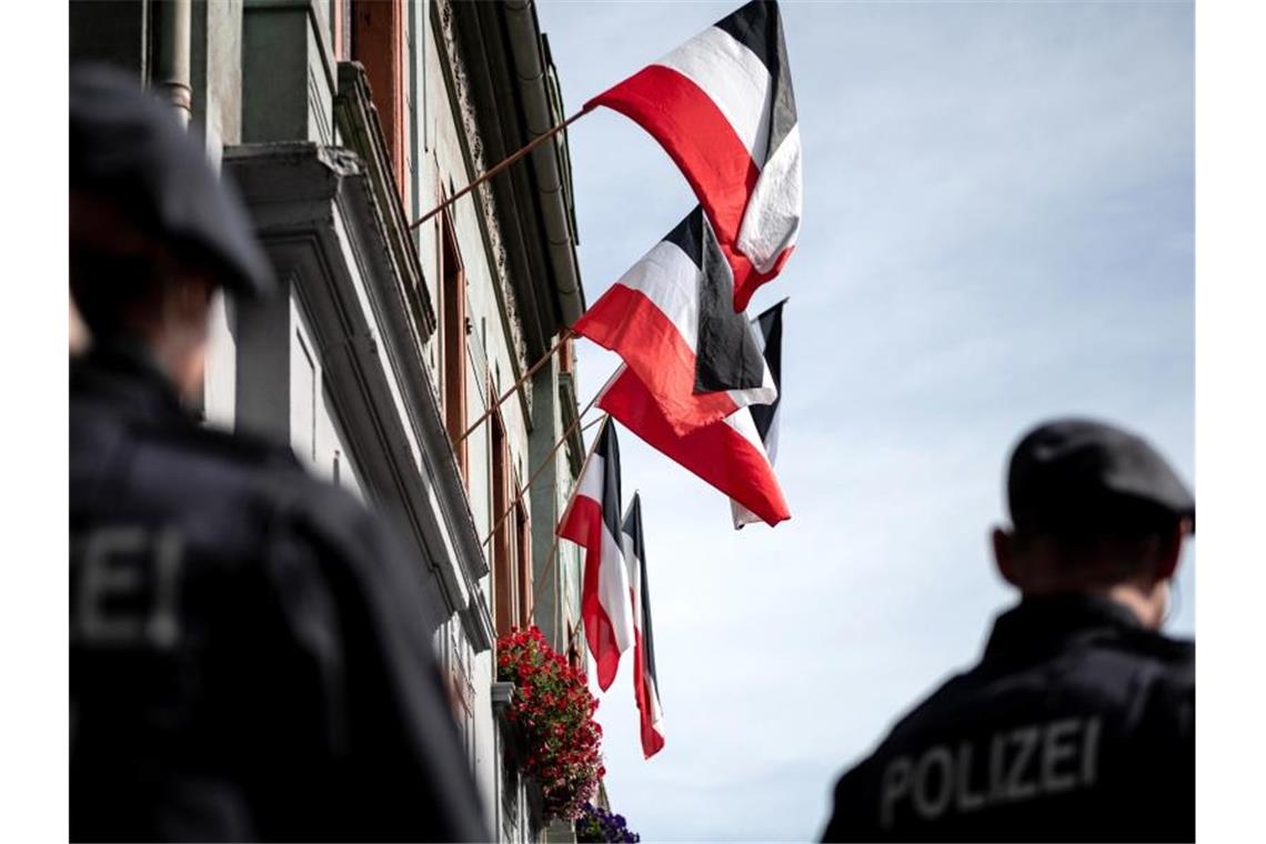 Reichsfahnen an den Fenstern von Rechstsextremisten bewohnter Häuser in Dortmund. Foto: Fabian Strauch/dpa