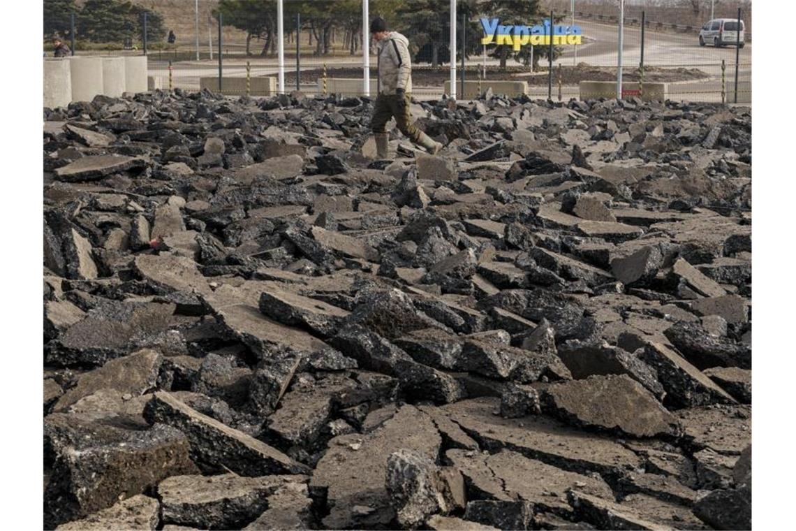 Ein Bauarbeiter geht über eine kaputte Straße vor dem Grenzübergang zwischen dem ukrainisch kontrollierten Gebiet und dem von prorussischen Separatisten kontrollierten Gebiet in Luhansk. Foto: Vadim Ghirda/AP/dpa