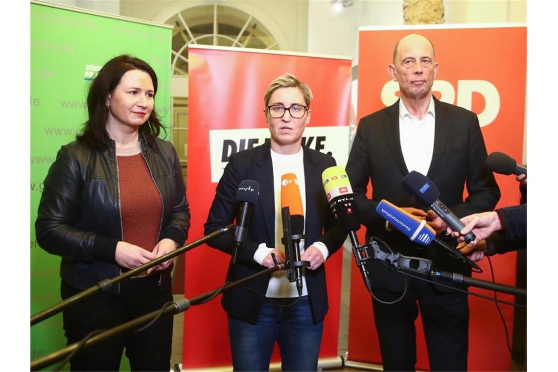 Thüringens Umweltministerin Anja Siegesmund (l-r) von Bündnis90/Die Grünen, die Linke-Fraktionsvorsitzende Susanne Hennig-Wellsow und Wirtschaftsminister Wolfgang Tiefensee (SPD) geben die Beendigung der Verhandlungen über eine Minderheitsregierung bekannt. Foto: Bodo Schackow/dpa-Zentralbild/dpa