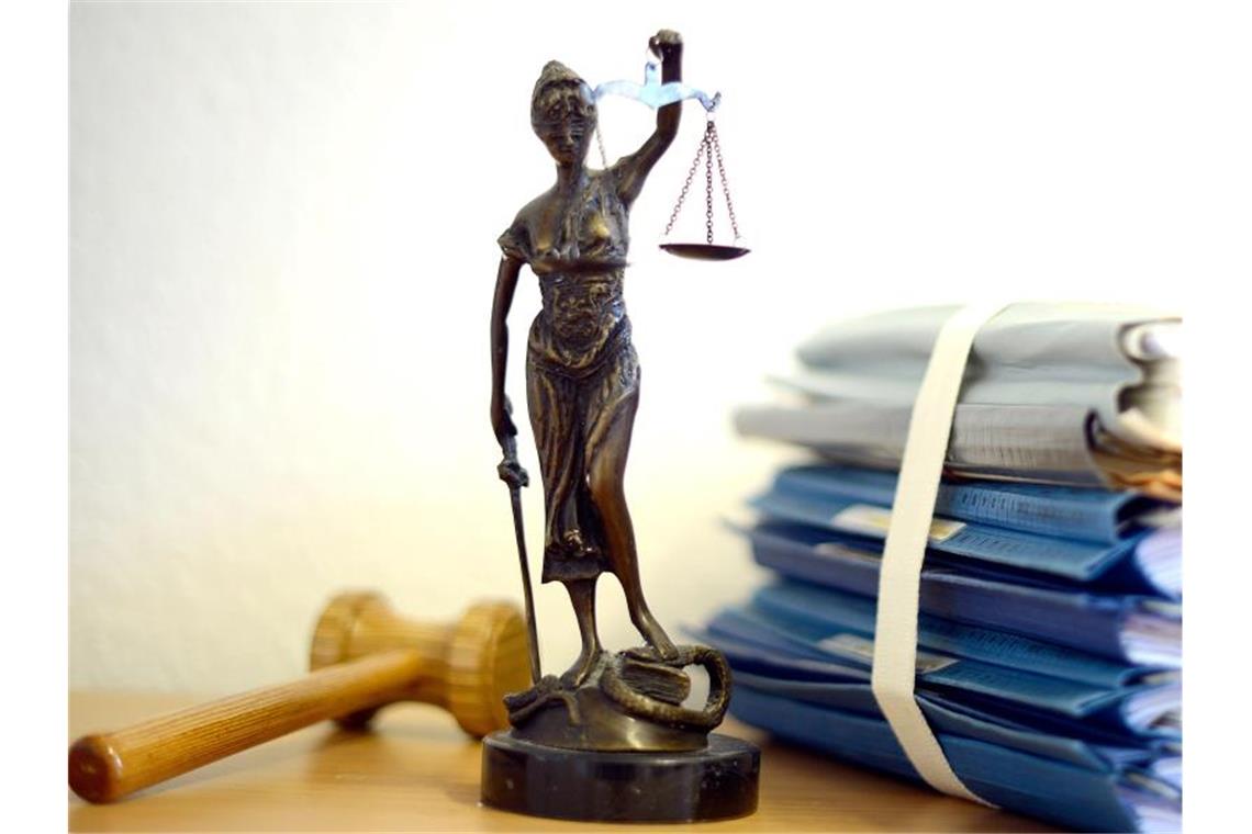 Die Justitia steht neben Akten und einem Holzhammer. Foto: Volker Hartmann/dpa/Archivbild