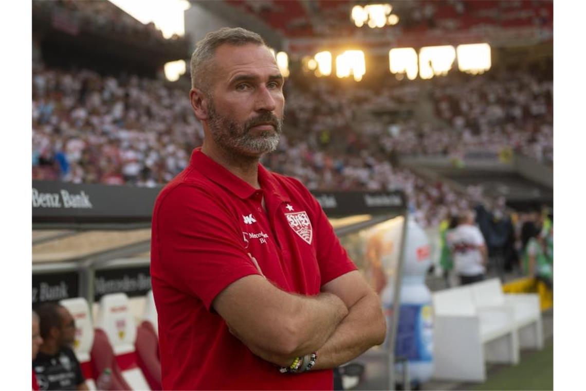 Stuttgarts Trainer Tim Walter vor Beginn des Spiels. Foto: Daniel Maurer/Archivbild