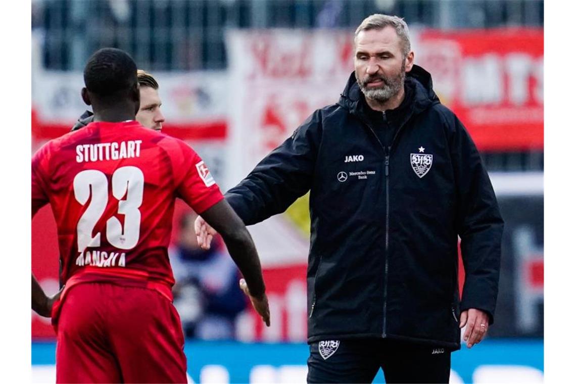 Stuttgarts Trainer Tim Walter (r) geht nach dem Spiel zu Orel Mangala. Foto: Uwe Anspach/dpa