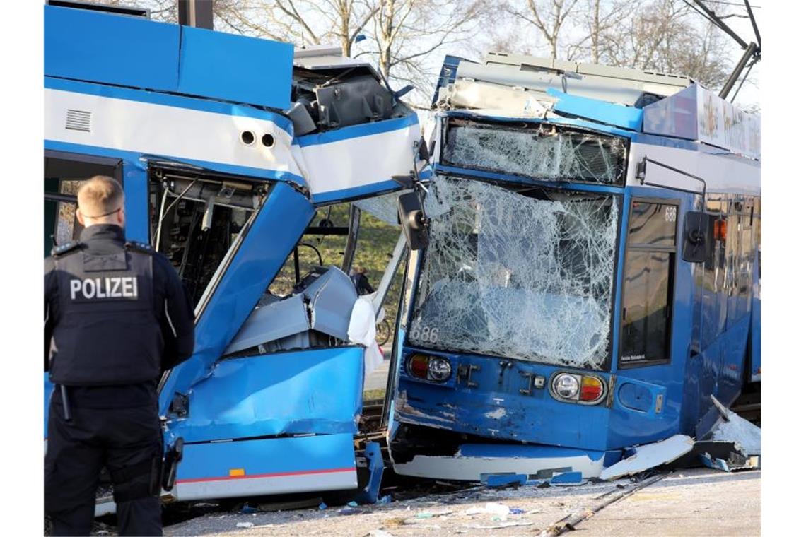 Nach einem Zusammenstoß von zwei Straßenbahnen in Rostock sichern Polizisten die Unfallstelle. Foto: Bernd Wüstneck/dpa-Zentralbild/dpa