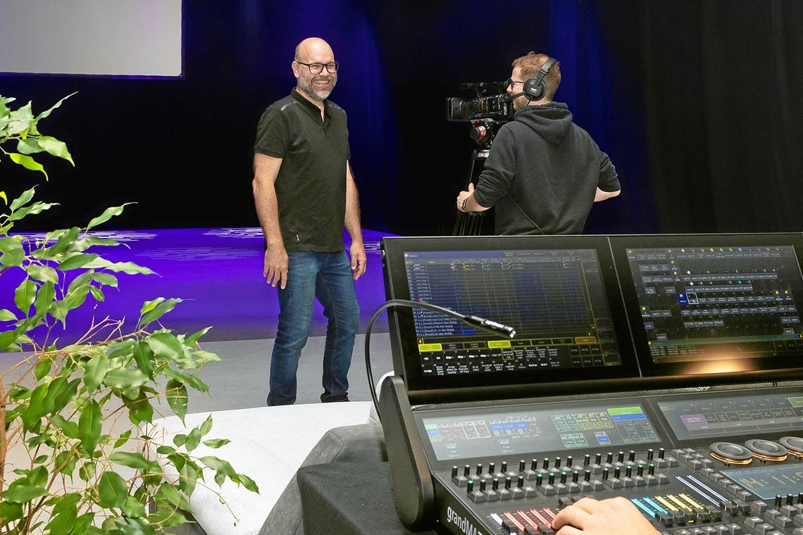 Jürgen Schuster und an der Kamera Tim Hautmann in der neuen Livestreamhalle. Foto: J. Fiedler