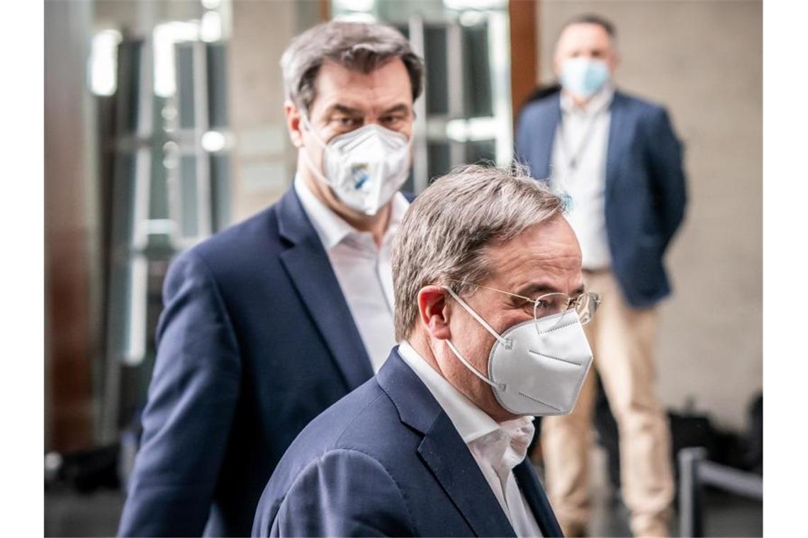 CSU-Chef Markus Söder und der CDU-Vorsitzende Armin Laschet auf dem Weg zu einer Pressekonferenz. Foto: Michael Kappeler/dpa