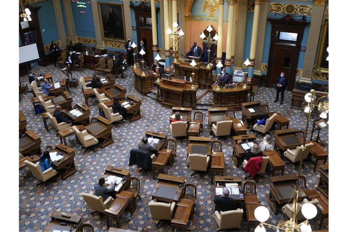 Die Sitzung des Wahlkollegiums des US-Bundesstaates Michigan wird eröffnet. Foto: Carlos Osorio/Pool AP/dpa