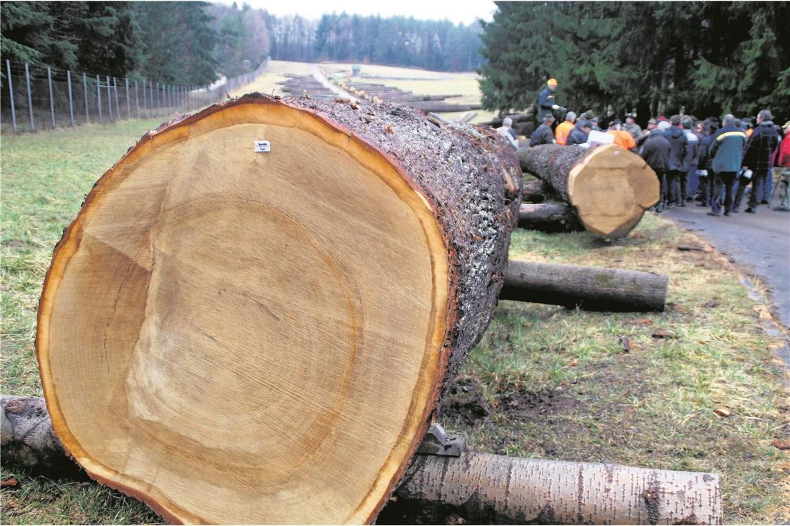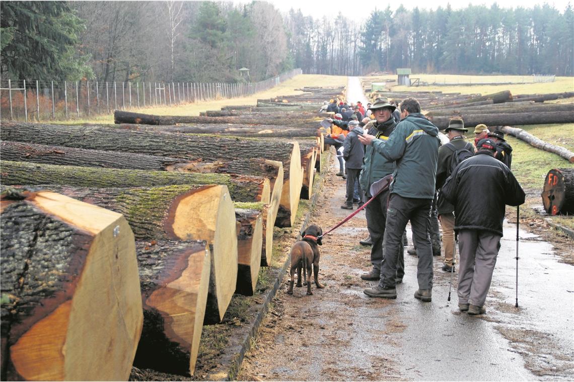Sauber aufgereihte Wertholzstämme, wie Perlen an einer Schnur: Die Crème de la Crème des Schwäbischen Waldes. Der teuerste Stamm wechselte für 3557 Euro den Besitzer. Foto: U. Gruber