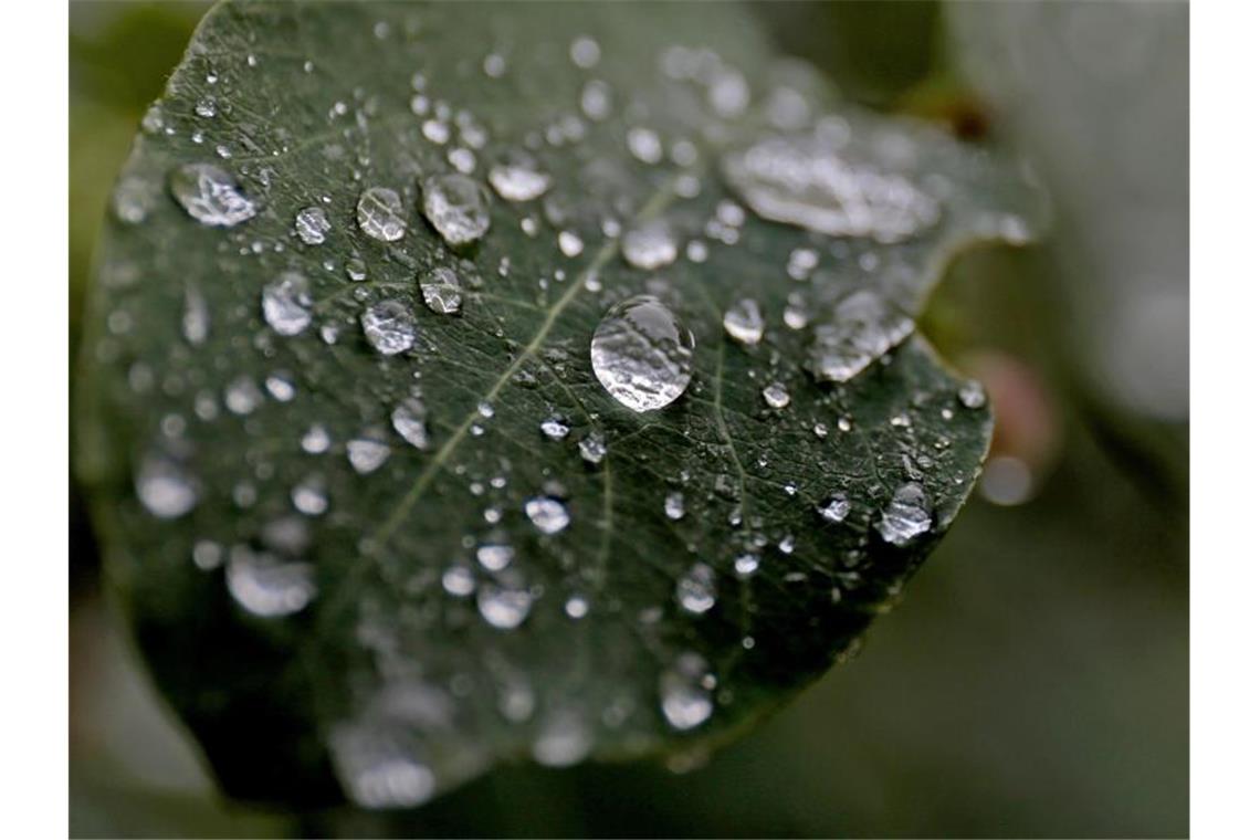 Regentropfen hängen auf dem Blatt eines Strauches. Foto: Oliver Berg