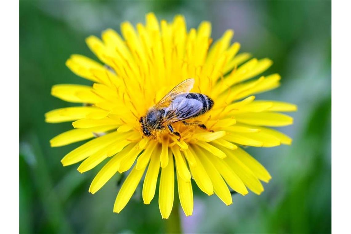 Eine Wildbiene sitzt auf einem Löwenzahn. Der BUND hat eine Bundesbehörde wegen der Zulassung von Pflanzenschutzmitteln verklagt. Foto: Jan Woitas