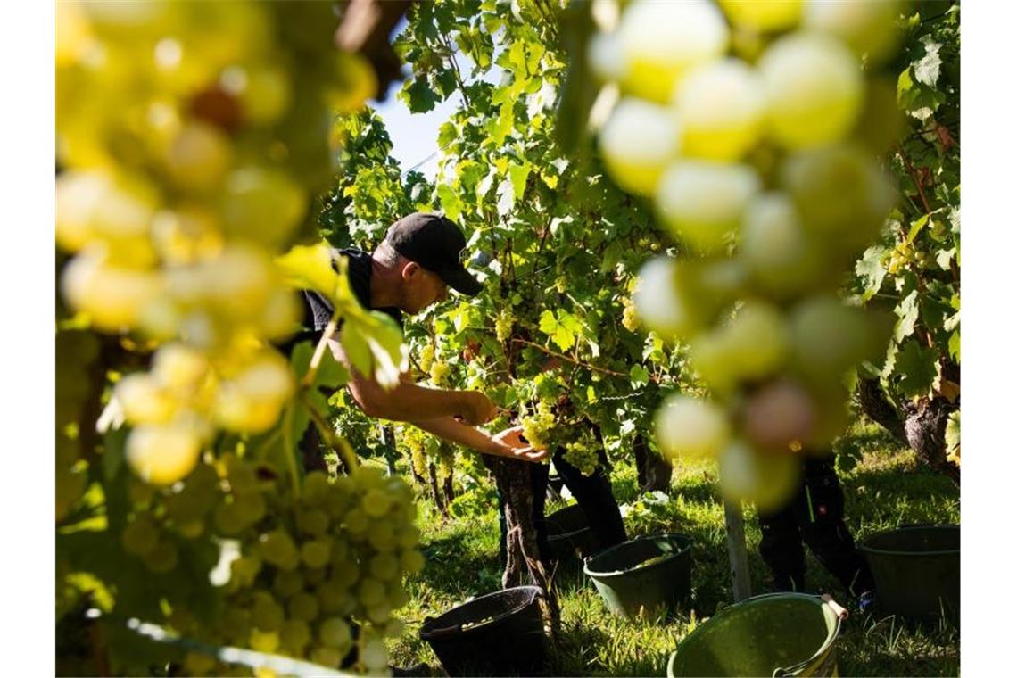 Ein Erntehelfer erntet reife Trauben von einer Weinrebe. Foto: Tom Weller/dpa/Archivbild