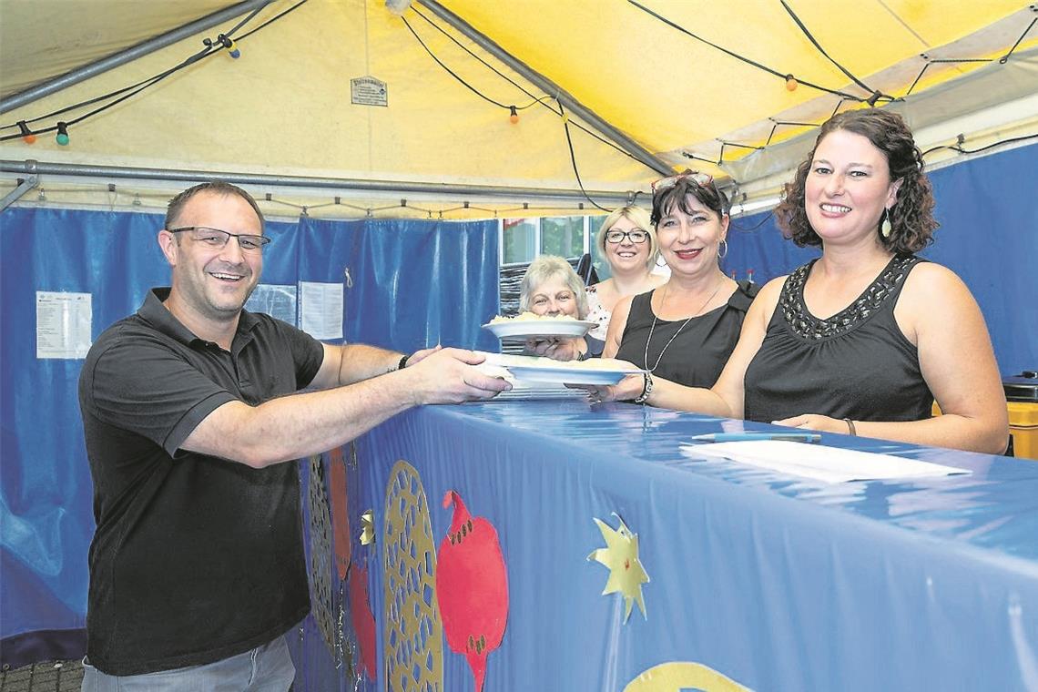 Brutzelzelt und Barausschank: „Fürs Geld mach mr’s net“, lacht Matthias Schif, Klarinettist im Musikverein Unterweissach, der heute mit anderen an der Bratpfanne steht. Alles passt, findet er: die Unterstützung durch aktive und passive Musikerkollegen sowie Freunde „Spaß macht es, klar!“ Man sei schließlich festerprobt und habe bei vielen vereinsinternen Feiern Erfahrungen gesammelt, ergänzt Posaunist Andreas Erb. Ein mindestens 15-köpfiges Team ist seit den Morgenstunden im Einsatz und wird später durch die zweite Schicht abgelöst. Die freundlichen Gelegenheitsköche danken allen Helfern von Herzen, vor allem aber den vielen, vielen anderen Vereinen. „Das geht quer durch die Familien“, weiß auch Anja Fichtner vom UCC, deren Team heute „alles außer Bier und Wein“ anbietet und zu vorgerückter Stunde mit größerem Ansturm rechnet.