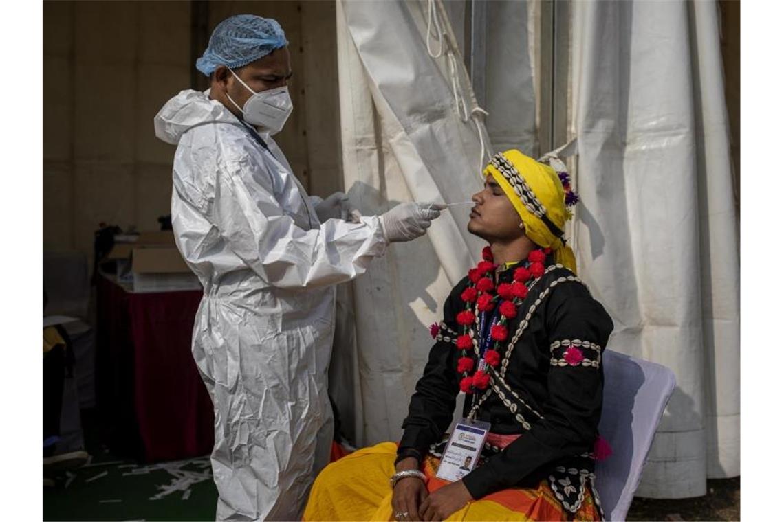 Ein Mitarbeiter des Gesundheitswesens macht in Indiens Hauptstadt Neu-Delhi einen Abstrich für einen Corona-Test. Foto: Altaf Qadri/AP/dpa