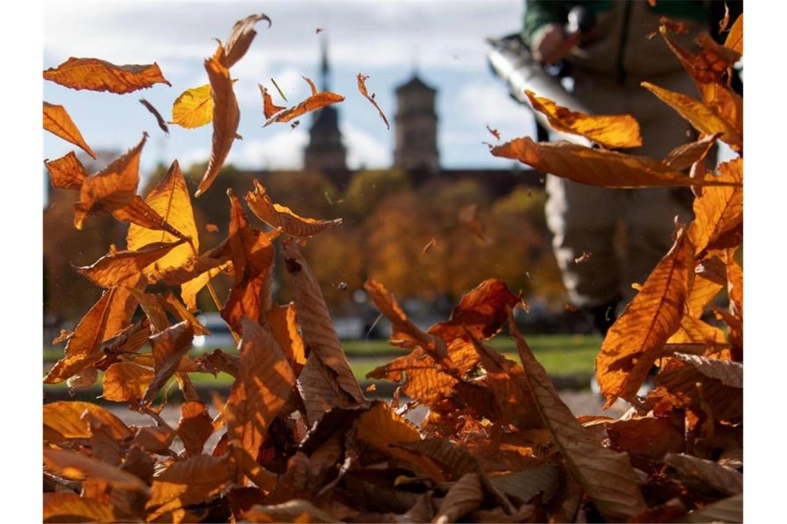 Herbstlaub wird von einer Mitarbeiterin des Zoologisch-Botanischen Garten Wilhelma auf dem Schlossplatz zusammengetragen. Foto: Marijan Murat/dpa