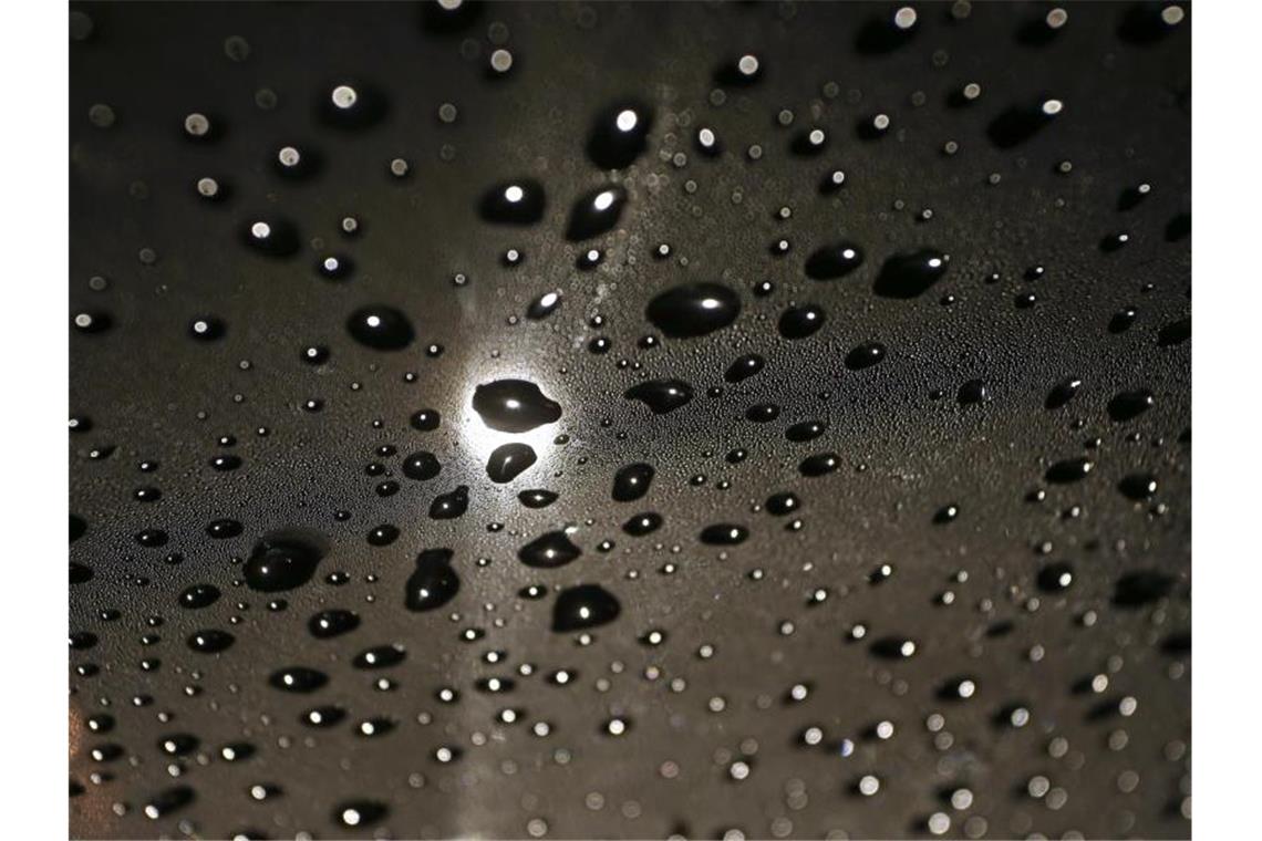 Regentropfen liegen im Licht einer Straßenlaterne auf der Windschutzscheibe eines Autos. Hoch „Manfreed“ zieht weiter, es wird kühler und nass. Foto: Karl-Josef Hildenbrand/dpa