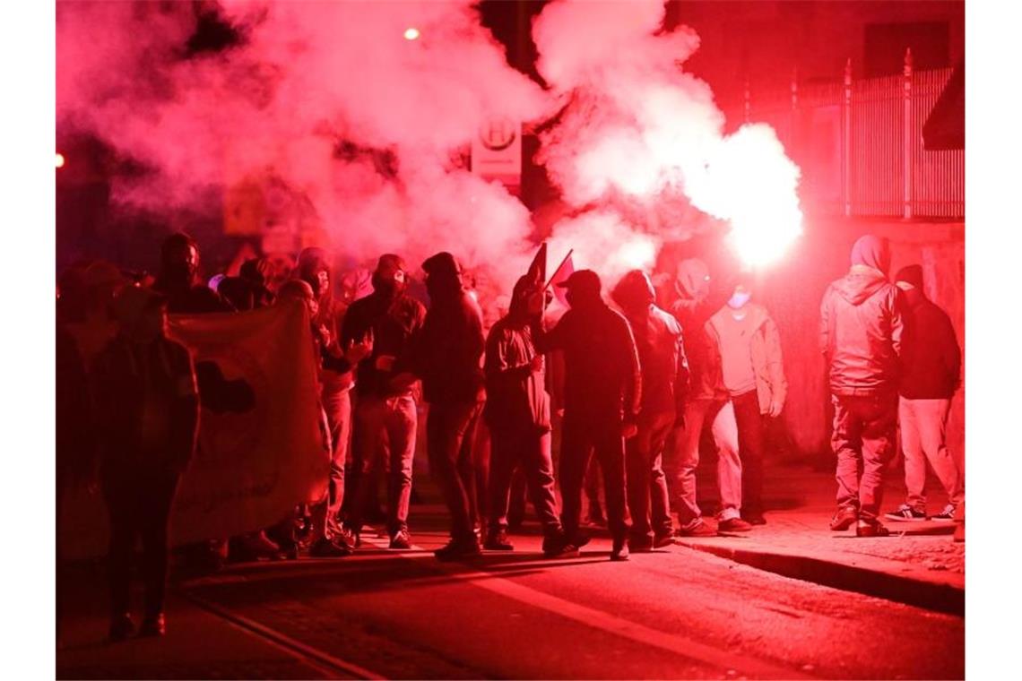 Teilnehmer der Demonstration unter dem Motto „Kämpfe verbinden - Für eine solidarische Nachbar*innenschaft“ ziehen mit roten Pyro-Fackeln durch den Leipziger Stadtteil Connewitz. Foto: Hendrik Schmidt/dpa-Zentralbild/dpa