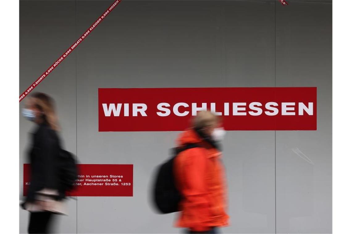Passanten gehen in der Kölner Innenstadt an einem geschlossen Ladenlokal vorbei. Foto: Oliver Berg/dpa