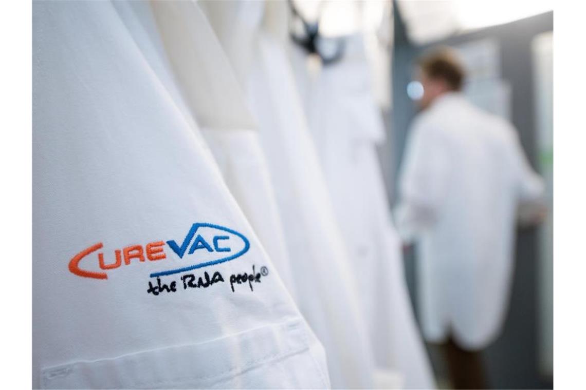 Ein Labormantel mit dem Logo des biopharmazeutischen Unternehmens CureVac ist zu sehen. Foto: Sebastian Gollnow/dpa/Archivbild