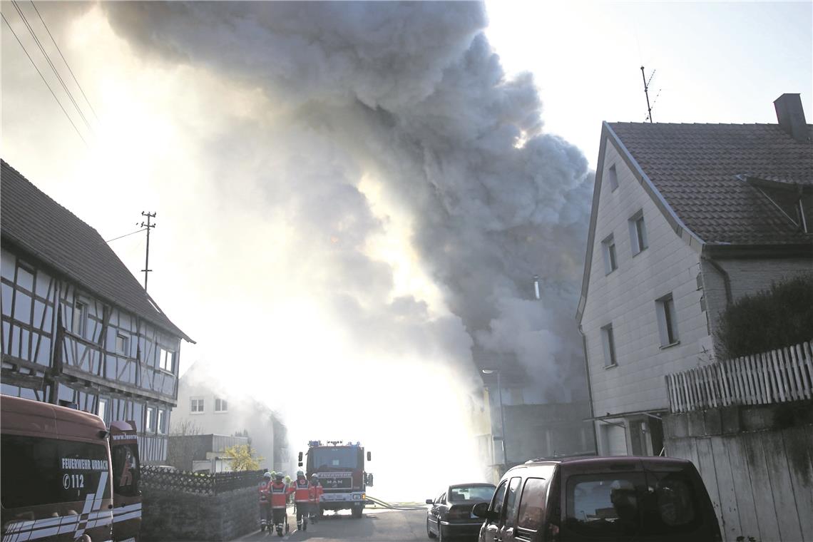 URBACH. Es war ein Brand, wie ihn auch erfahrene Mitglieder der Feuerwehr Urbach noch nicht erlebt haben. Gegen 7.30 Uhr ging der Alarm ein: Feuer in einer Wohnung im ehemaligen „Ochsen“. Als die Einsatzkräfte eintrafen, stand das Gebäude bereits voll in Flammen. Nachbarn hatten den Hausbewohnern zuvor geholfen. Der Rauch, den der Wind am Freitagmorgen durch die Beckengasse in Urbach drückt, ist teilweise so dicht, dass alles darin verschwindet. Auch eineinhalb Stunden nach Ausbruch des Feuers schlagen noch die Flammen aus dem zerstörten Dachstuhl. Flaut der Wind ab, steigt eine massive Rauchsäule hoch in den Himmel.