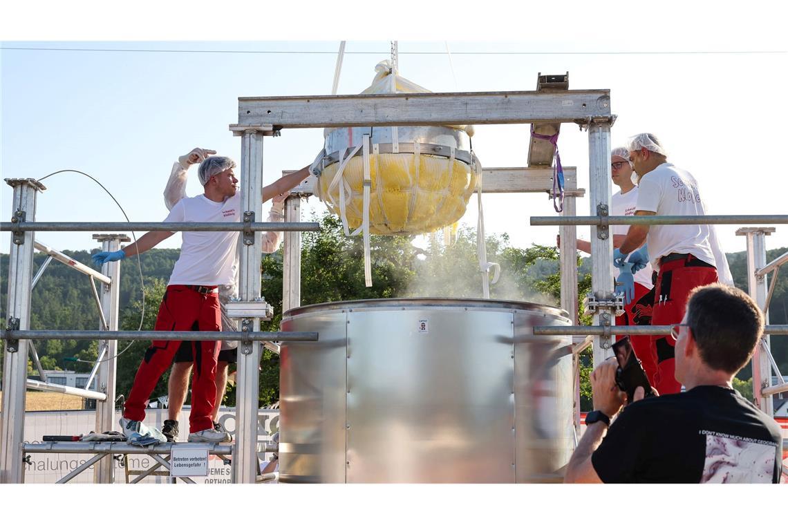 Der Rekordkloß wird nach 21-stündiger Zubereitung aus dem Riesen-Kochtopf gehoben.