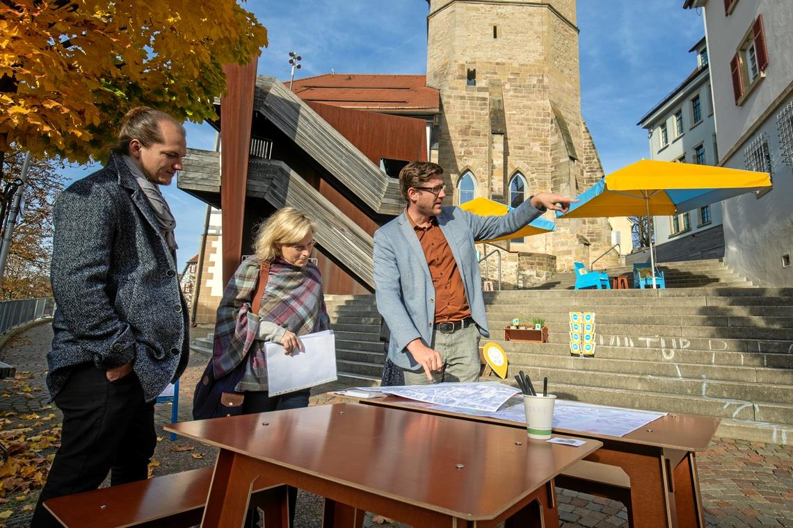 Backnang. Wie wird sich die Backnanger Innenstadt in der Zukunft verändern? Ideen und ein Zukunftskonzept hat die Stadt Backnang schon, wie sehr sich diese Ideen mit den Wünschen und Bedürfnissen der Bevölkerung überschneiden, konnten die Stadtplaner gestern Nachmittag herausfinden. Baudezernent Stefan Setzer, Stadtplanungsamtsleiter Tobias Großmann und Kulturamtsleiter Johannes Ellrott haben sich beim gelben Bauwagen des Projekts „Spiel:Raum“ am Stadtturm den Fragen der Bürgerinnen und Bürger gestellt, Konzepte erklärt und Anregungen aufgenommen. Das Fazit: „Die Leute sind sehr interessiert. Und vieles ist deckungsgleich mit unserem Konzept“, sagt Großmann. Er schätzt, dass etwa 14 bis 16 Besucher da waren, die Zukunftspläne der Stadt wurden zum Teil auf Plänen diskutiert, zum Teil warf man auch mal direkt einen Blick auf die unterhalb liegende Marktstraße.