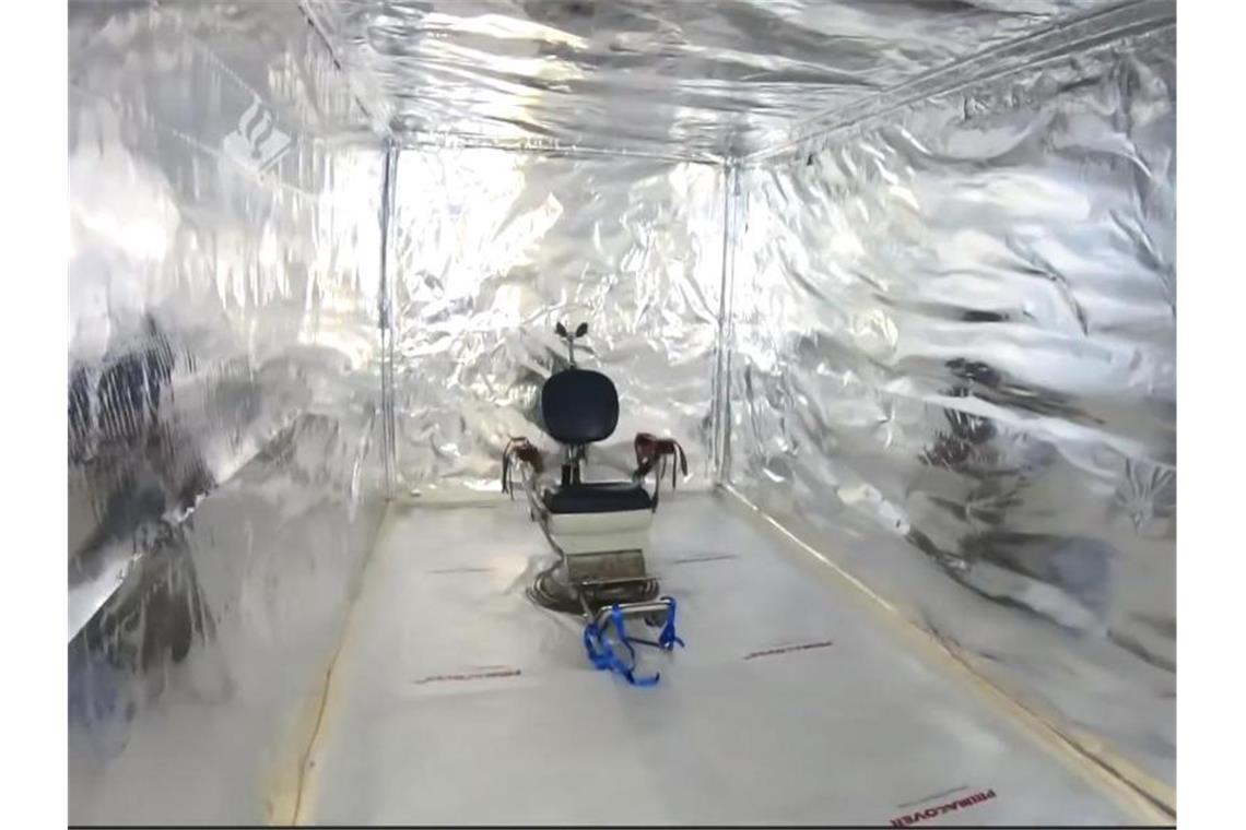Ein Container, von innen dick mit silberner Folie isoliert. In der Mitte ein altmodischer Zahnarztstuhl mit Riemen zum Festschnallen der Arme, dazu Handschellen und ein ganzes Arsenal an Werkzeugen, um Menschen zu quälen.