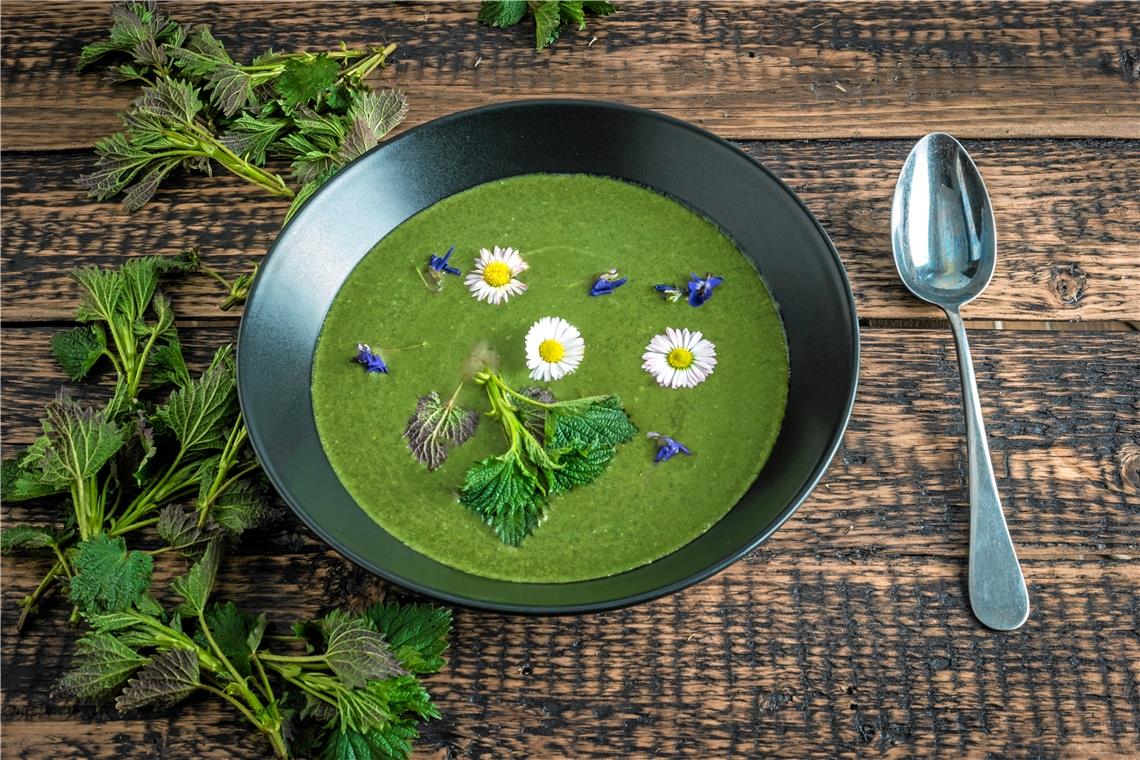 Nicht unüblich: Als krönender Abschluss wird die Gründonnerstagssuppe unter anderem mit Gänseblümchen garniert. Foto: Adobe Stock/JiriD
