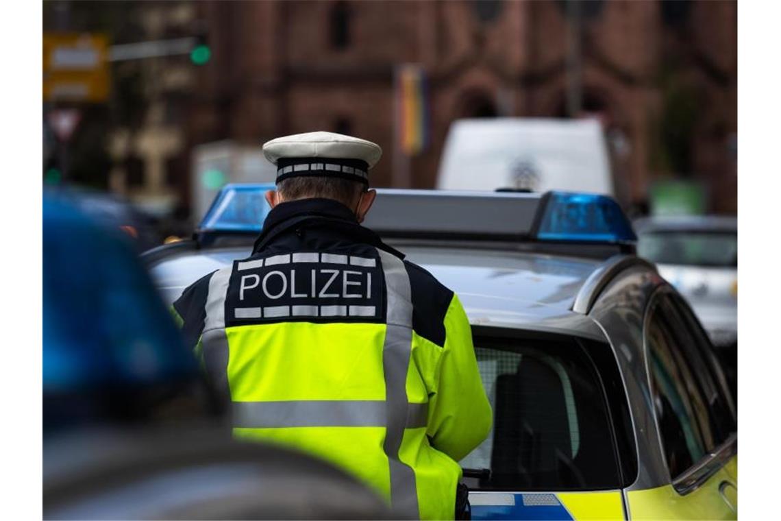 Ein Polizeibeamter steht zwischen zwei Einsatzfahrzeugen der Polizei. Foto: Philipp von Ditfurth/dpa/Symbolbild