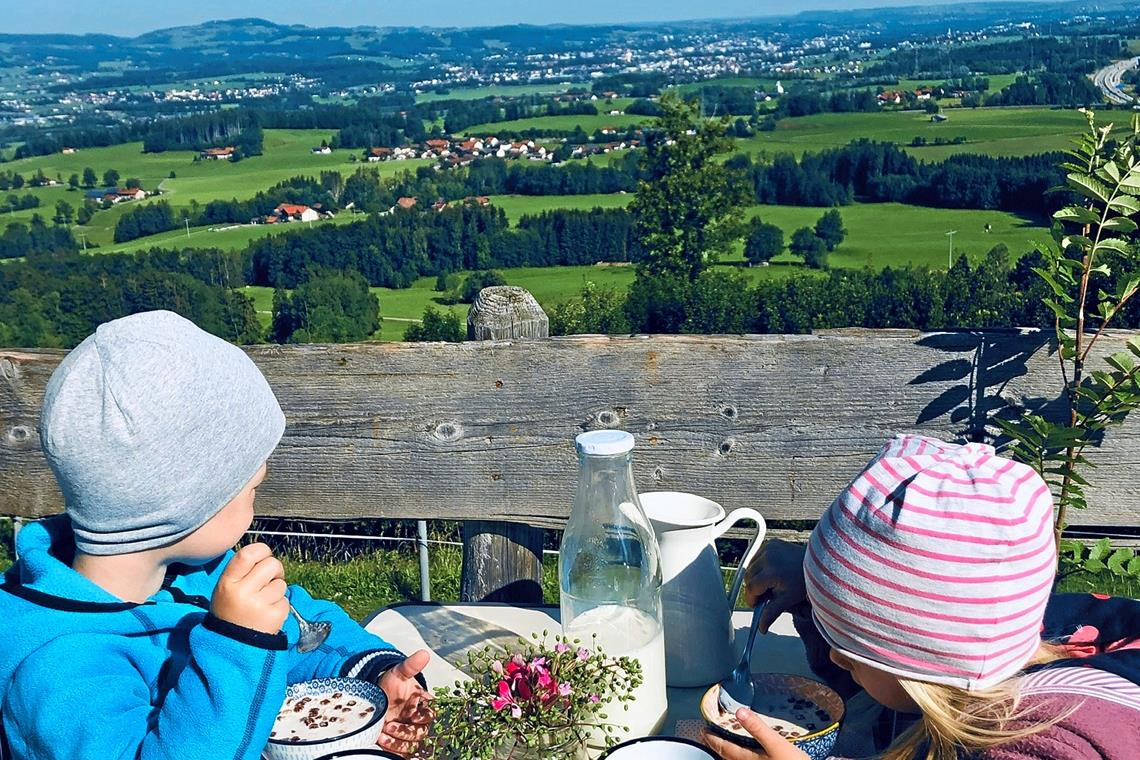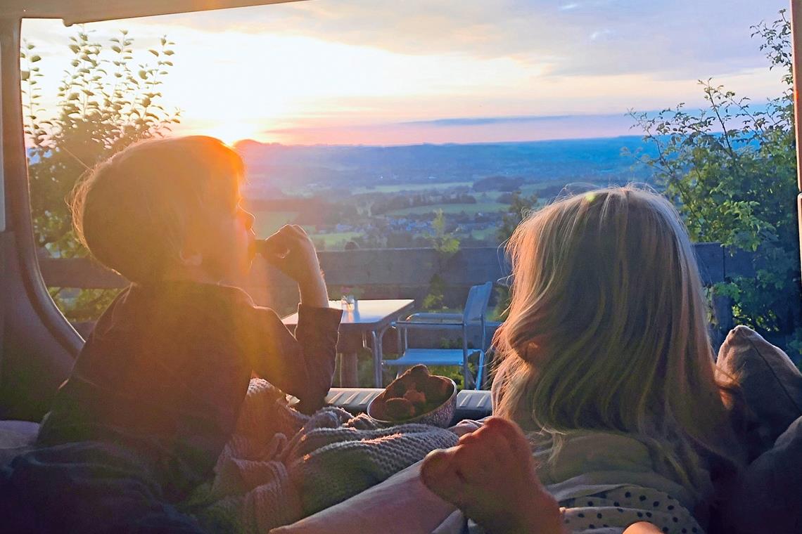 Für die junge Familie war auch klar, dass Wandern zum Urlaub gehört. Also ab in die Berge. Der Camper bog nach links ab, Ziel war nun das Allgäu. Dort hatten die Urlauber einen Stellplatz bei einem Milchbauern ausgemacht. „Das war lustig, auf den Berg hochzufahren, links und rechts die Kühe, und überall hörte man die Kuhglocken. Und von unserem Platz aus hatten wir einen traumhaften Blick hinunter ins Tal“, sagt Marius Schumann. „Und dann kam auch der Milchwagen. Die Kinder haben mal erlebt, woher die Milch kommt und wo sie hingeht“, ergänzt seine Frau. Toll sei auch gewesen, dass man überall auch die landwirtschaftlichen Produkte direkt vom Erzeuger hat kaufen können. „Die Kinder haben für uns dann die Eier geholt und unsere Essensreste an die Schweine verfüttert.“ Sie haben eine Welt kennengelernt, die sie vorher so nicht kannten.