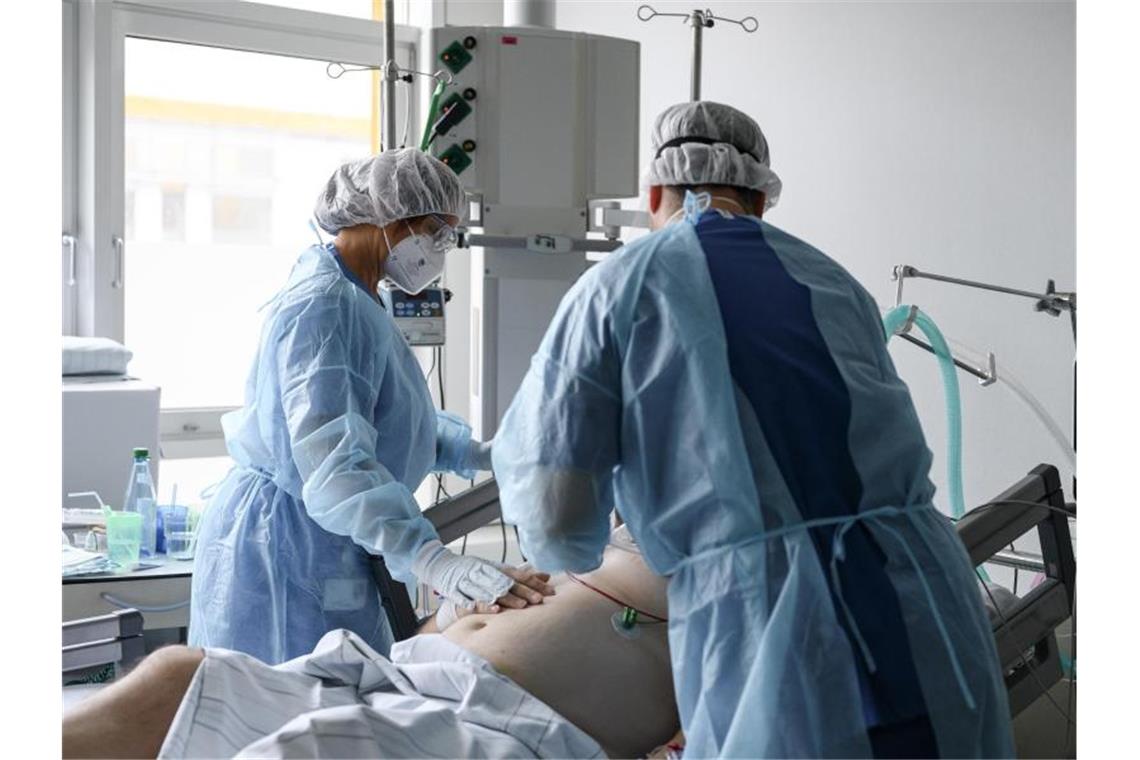 Die pflegerische Leitung der Intensivstation und Intensivstationsarzt bei einem Corona-Patienten auf der Intensivstation. (Archivbild). Foto: Daniel Vogl/dpa