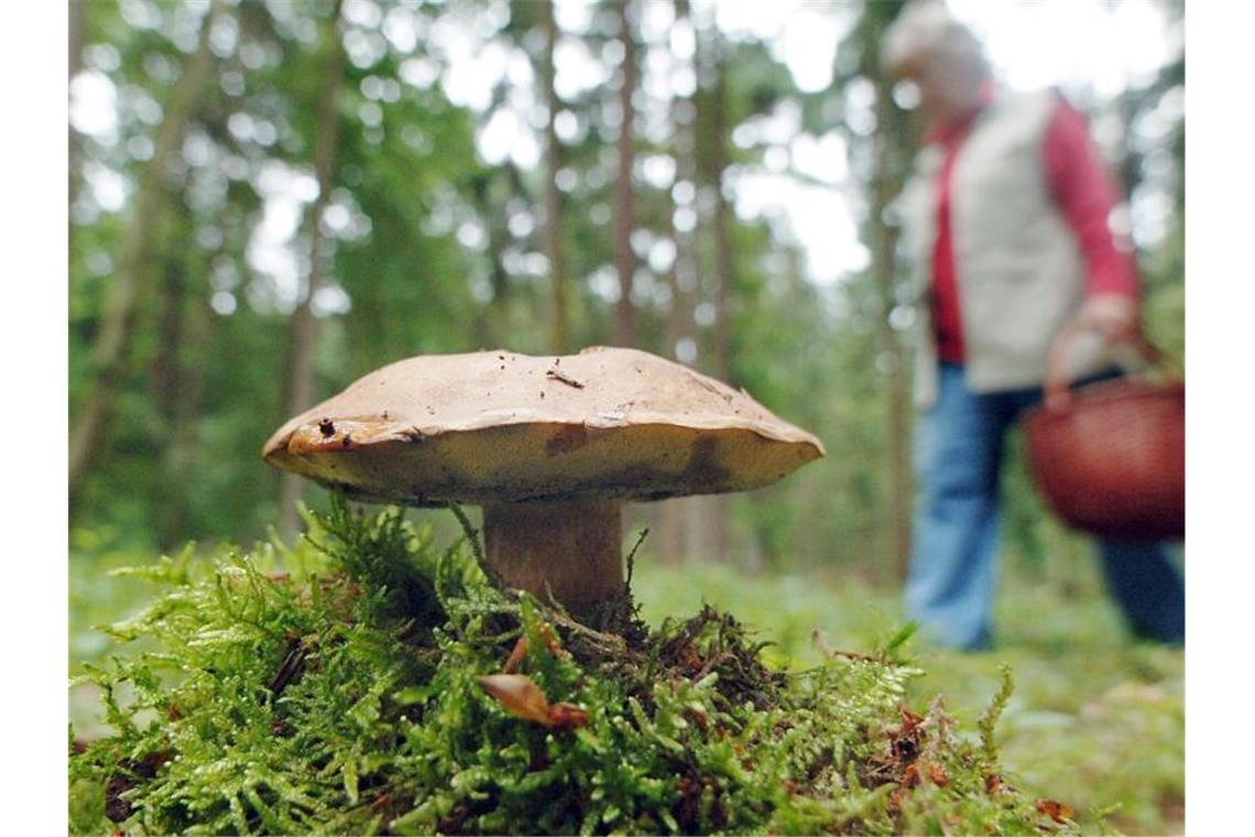 Eine Frau geht nahe dem niederbayerischen Wiesenfelden an einem Maronenröhrling-Pilz vorbei. Foto: Armin Weigel/Archivbild